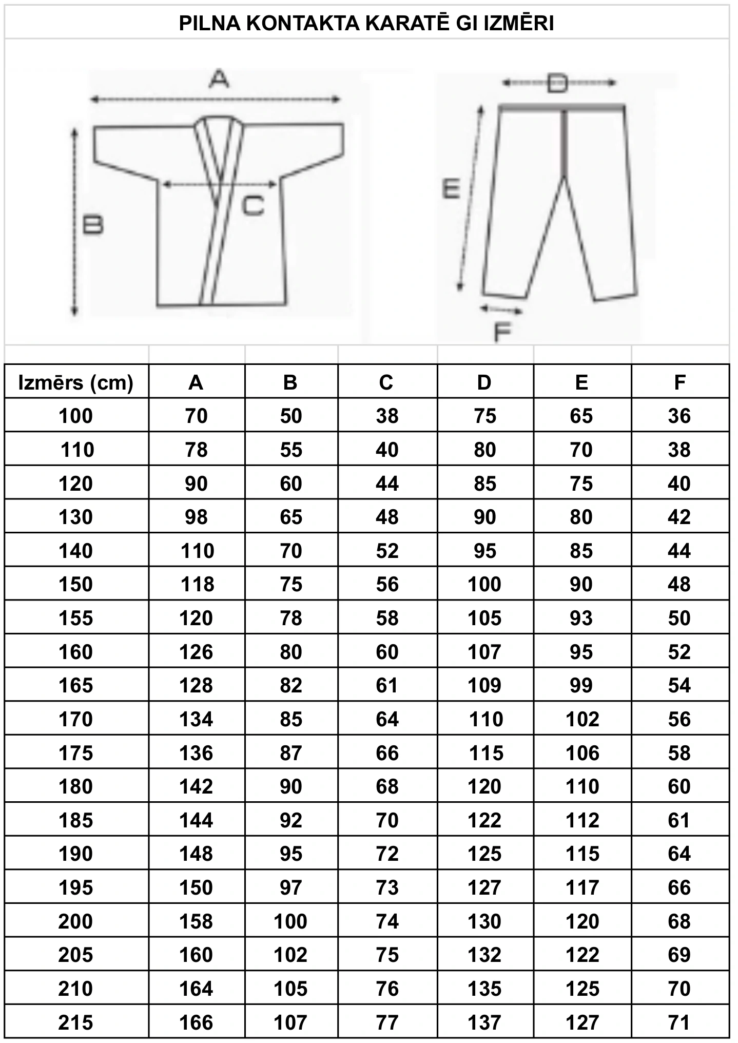 Pieejamie izmēri no 100cm līdz 215cm. Izmēriem līdz 155cm bikses ar elastīgu jostasvietu, sākot ar 160cm jostasvieta savelkama ar auklu.